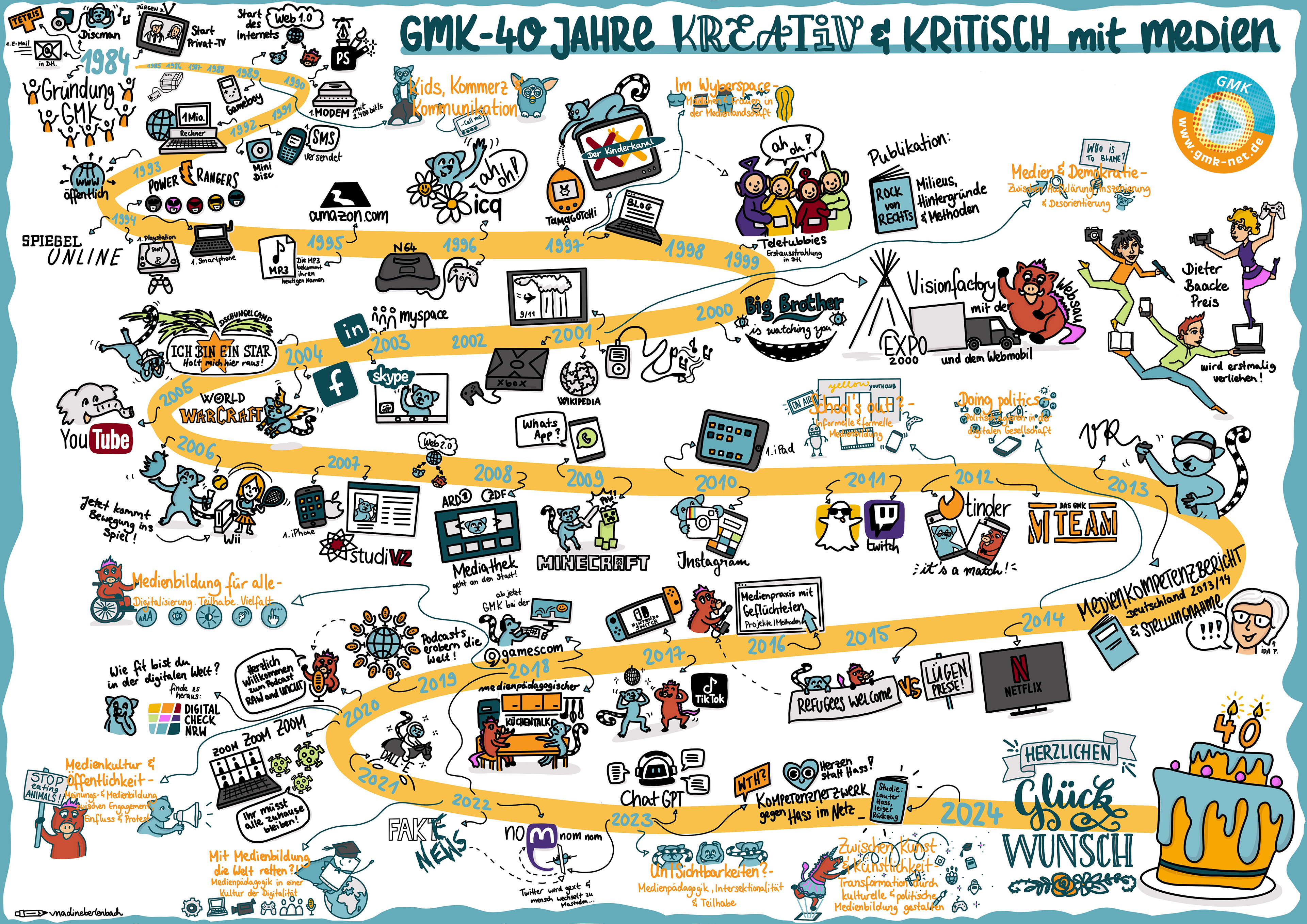 Illustration im Sketchnotestil zu 40 Jahren GMK und 40 Jahren medienpädagogischen Diskursen